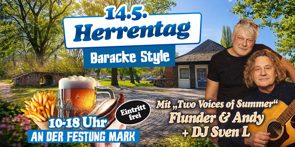 Wir lassen die legendären Zeiten des Studentenklubs Baracke wieder aufleben und dazu gehören nicht nur die Partys, sondern auch die jährlichen Herrentagstreffen mit Live-Musik. Auf zahlreichen Wunsch laden wir am 14. Mai ein zur Herrentagsfeier im Baracke-Style. Mit dabei ist auch wieder Flunder, diesmal mit Andy als „Two Voices of Summer“. Zwischen den Live-Parts sorgt DJ Sven für die passende Stimmung.