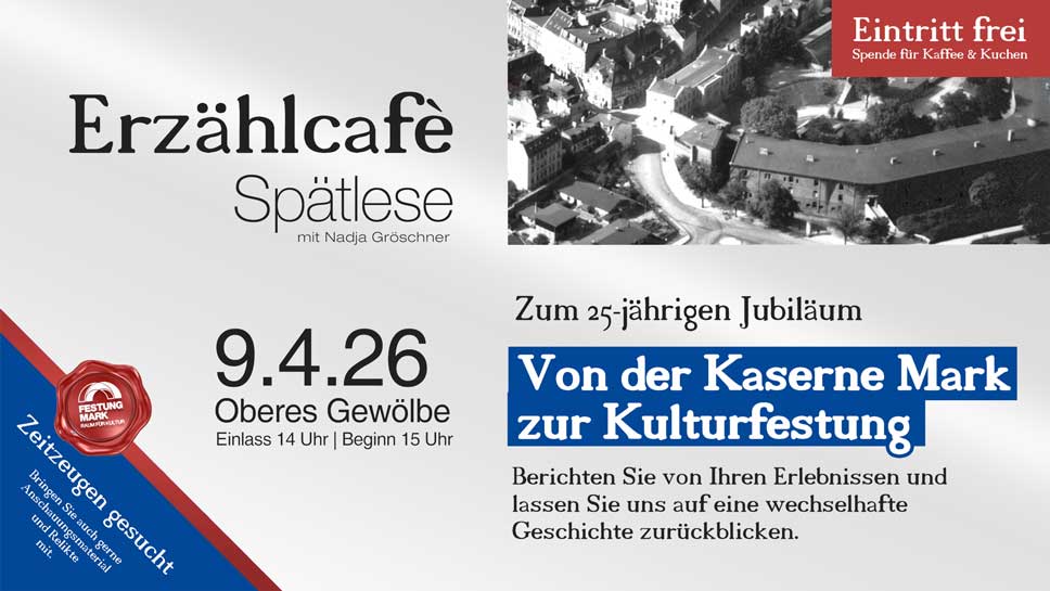 Der Geschäftsführer der Festung Mark, Christian Szibor, gibt einen Einblick in die Entwicklung der letzten 25 Jahre – von der ehemaligen Kaserne zur Kulturfestung. Im Mittelpunkt stehen vor allem Erinnerungen an die Nutzung der Festung ab dem 20. Jahrhundert. Um 1960 standen Teile der Anlage sogar vor dem Abriss. Ab etwa 1980 gab es Pläne der FDJ, Teile der Festung als Studentenzentrum zu nutzen, bevor nach der Wende schließlich die Grundlage für die heutige kulturelle Nutzung geschaffen wurde. Es werden spannende Einblicke aus den aktuellen Recherchen zur Geschichte der Festung präsentiert. Diese fließen in eine reich bebilderte Publikation ein, die zum 25-jährigen Jubiläum der Kulturfestung am 4. Oktober 2026 erscheinen soll.